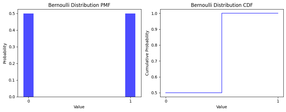 伯努利分布是一种离散分布,用来描述只有两种可能结果的随机试验。例如,抛硬币的结果(正面或反面)就可以用伯努利分布来描述。伯努利分布的概率质量函数为: